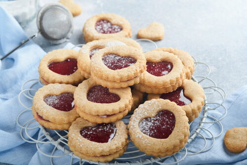 - Hotové koláčky spojujeme marmeládou – natřeme plný koláček, zakryjeme vykrojeným – a posypeme moučkovým cukrem.